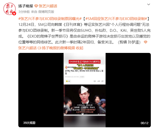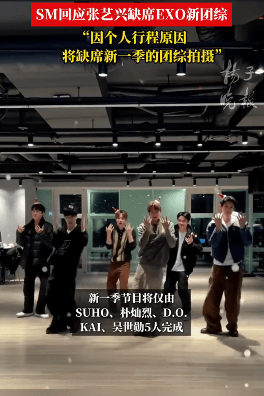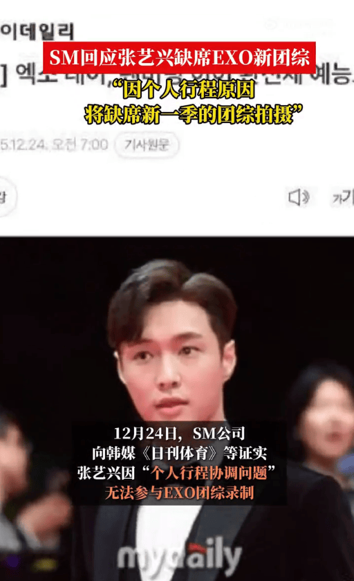 12月24日,SM公司向韩媒《日刊体育》等证实张艺兴因“个人行程协调问题”无法参与EXO团综录制。新一季节目将仅由SUHO、朴灿烈、D.O.、KAI、吴世勋5人完成。《EXO的爬梯子世界旅行》是由命运的爬梯子游戏决定旅行出发地以及睡觉的位置等等的网络综艺。此次新一季时隔2年回归,备受关注。